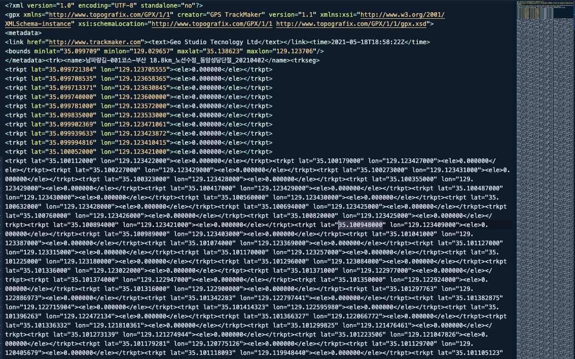 위와 같은 gpx 파일을 xml로 변환해서 lat과 lon 값을 받아와 지도에 뿌려주는 기능 구현 중 맞닥뜨린 난관 .. ,